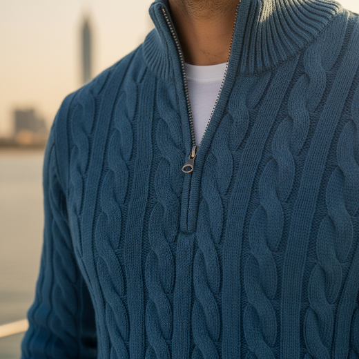 Blød og varm strik i høj kvalitet, designet til komfort og stil.Det klassiske kabelmønster og den rene pasform skaber et elegant udtryk, der passer til både hverdag og mere formelle anledninger.Et sikkert valg for dig, der sætter pris på kvalitet og tidløst design.